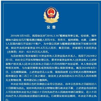 为及时查找7张涉案银行卡资金所有人及资金流水关系人,我局于2024年2月1日,向社会公开发布财物处理公告,要求涉案资金所有人(含资金转入上述涉案账户的关系人)在本公告发布之日起六个月内持财产合法证明、本人身份证明等相关材料,与办案民警联系或到我局办理认领款项事宜。截至2024年8月1日,公告期限届满,上述资金仍无人认领,现我局依照《公安机关办理刑事案件程序规定》第二百三十三条之规定,依法对上述冻结的422.95万元人民币按照无主财物处理,将其登记后上缴国库。